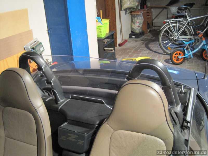 Hier kann man den nachträglichen Ausschnitt vom Vorbesitzer gut erkennen. Der Vorteil ist, dass man bei geschlossenen Verdeck gut in den "zusätzlichen Stauraum" (Verdeckmuldenkasten) hinein greifen kann. Ein Nachteil ist, dass bei offener Fahrweise auch der Wind durch diese Öffnung weht.