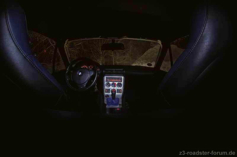 Eine hohe Verschlusszeit und eine kleine Blende an der Kamera eingestellt. Selbstauslöser. Mit der Taschenlampe während der Aufnahme (ich glaube es waren 15-20 Sekunden) durch die Heckscheibe ins Innere Leuchten.