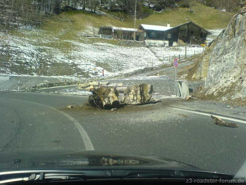 Karfreitag - Abfahrt vom Brünigpass zum Brienzersee - ca. 5 Minuten vorher waren wir im Restaurant links der Strasse (nicht zu sehen) eingekehrt - Den Aufprall hörten wir nur, aber mir ist fast die Kaffeetasse aus der Hand gefallen - Waren zwar mit dem Fünfer unterwegs, aber das hätte bei dem Stein wohl keinen grossen Unterschied gemacht...