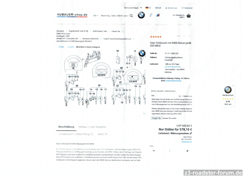 Miky2147 hat geschrieben:Hello, I'm writing to you from Italy, I have a 1999 BMW Z3 2.8 and I need to buy a new remote control key (433 MHZ, right?). I contacted 2 different BMW workshops and they told me that it can no longer be ordered. I saw on HUBAUER that a set was available that includes the remote control key I need, code 51 21 1 000 226. Is this the correct code? I said "It was available" because it was until last Wednesday afternoon... Now the link is no longer valid