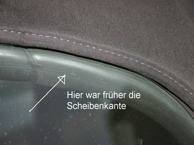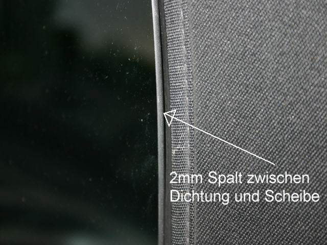 war jetzt 1 1/2 Wochen im Ruhrgebiet und habe beim Packen des Wagens festgestellt, daß mir beim Anmontieren der Türverkleidung die Lautsprecherabdeckung eingedrückt und die Türinnendichtung an der Scheibe nicht richtig eingebaut wurde. Ich also wieder zu den "Freundlichen" und habe das reklamiert - Die Antwort lautete: "Kommen Sie nach Ihrem Trip hier vorbei, wir bringen das in Ordnung." Während der Fahrt auf der Autobahn ins Ruhrgebiet war Platzregen und ich wunderte mich, daß es mir im Nacken zog und es extrem laut war, schaute mich um und stellte fest, daß die Scheibe nicht mehr an der Verdeckdichtung anlag. Ich also bei Regenunterbrechung auf einen Rastplatz bei Gießen und begutachtete die Reparatur mal genauer. Dabei stellte ich fest, daß die Scheibe nicht mehr ihren alten Sitz hatte sondern im hinteren Bereich ca. 6-8mm zu hoch stand. Die Scheibe wurde also in der hinteren Führungsschiene falsch eingebaut. Dadurch steht die Scheibe schief und durch die Wölbung des Glases kann die Scheibe sich nicht an die Dichtung anschmiegen. Im Ruhrgebiet angekommen erstmal die "Freundlichen" kontaktiert und habe zur Auskunft bekommen, sie wollten sich nach meiner Wiederkehr darum kümmern und prophylaktisch schonmal einen neuen Fensterheber bestellen.
