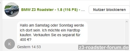 Insgesamt musst du den Wagen irgendwie von der Masse abheben. Und wie schon erwähnt, das Hardtop kannst du auch separat verkaufen bzw. beim Verhandeln als Option in der Hinterhand behalten.