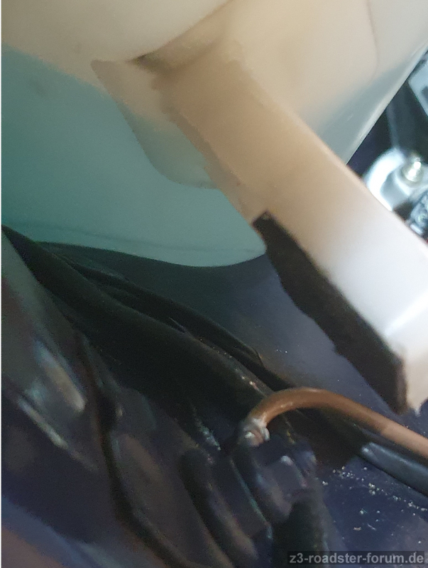 Unter den Wischwassertank hab ich unter die eckige Aufnahme (bei der schwarzen Plastik Schlitz-"Schraube") einen zusätzlichen Filzstreifen geklebt, wegen Scheuerstelle und Lackvorschädigung.