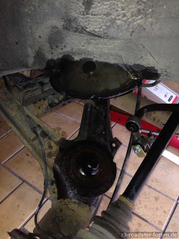 Dann Federbein demontiert, die drei Schrauben am Achsschenkel saßen extrem fest, die gingen wirklich erst nach mehrmaligem einsprühen und andauerndem hin und her drehen raus
