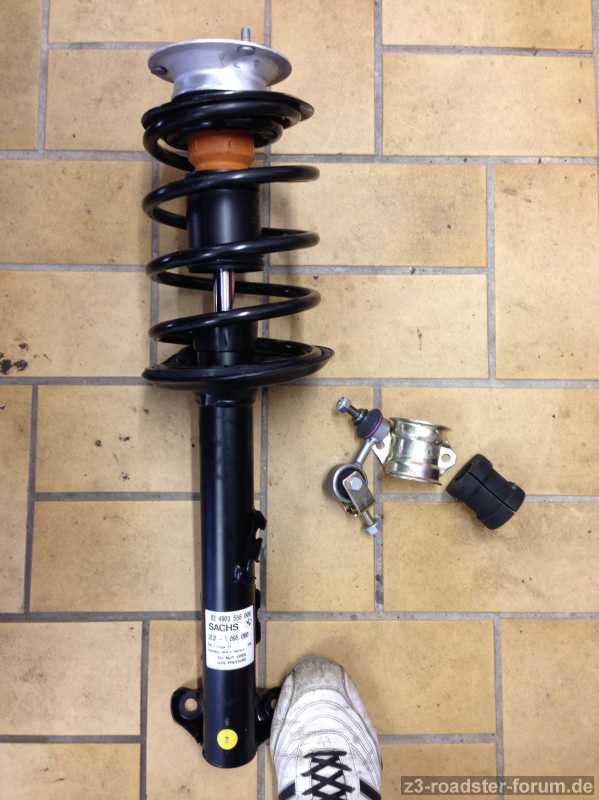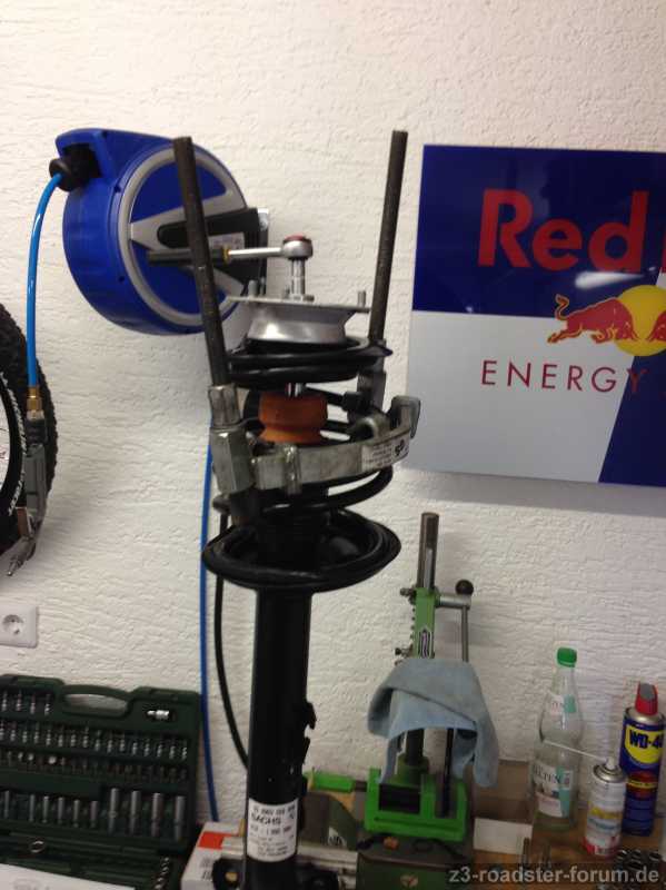 Dann habe ich das Federbein umgeschraubt, d.h. altes demontiert, um an die Feder zu kommen. Anschließend die neue Einheit zusammen geschraubt neuer Stoßdämpfer + Federunterlage, Federteller oben + Federunterlage und Domlager.