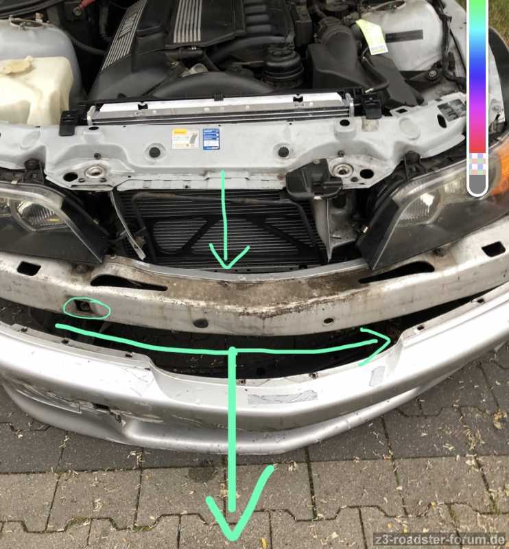 Weil der StahlTräger von der Mitte nach rechts wanderte und man im Bild den pralldämper an der Öffnung für den Abschlepphaken(links) m.E erkennen kann.