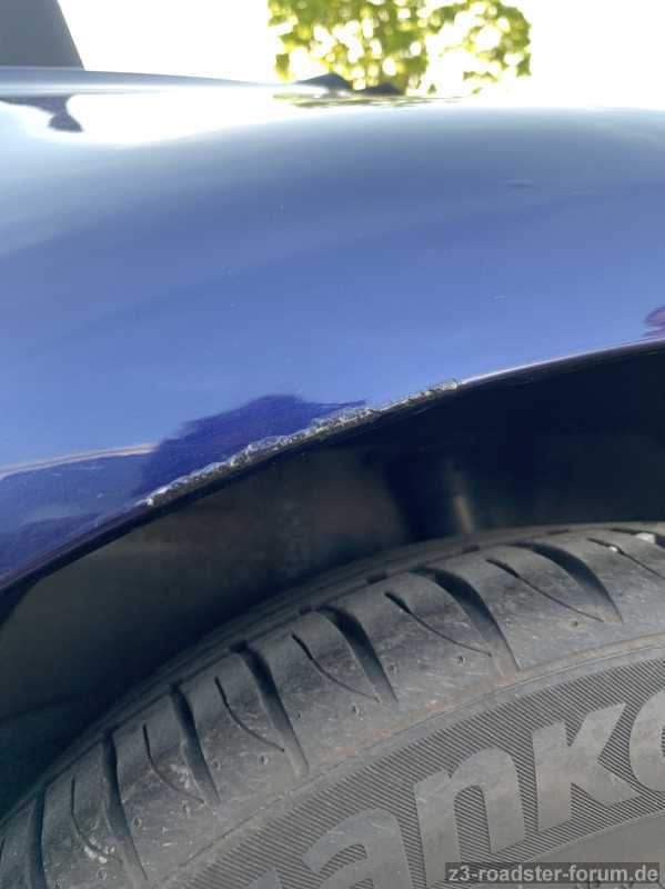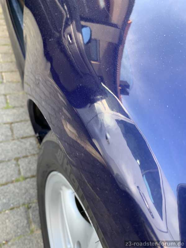- Der Lack hatte in der Tat ringsum ein paar Schäden, vor allem eine Stelle am linken Radkasten sah aus, als ob es da mal einen Rempler gab, der nicht fachmännisch behandelt wurde. Das Blech ist verdellt und eine ca. 5cm lange Stelle an der Kante des Radkastens wurde mit einer schwarzen Masse überpinselt. An