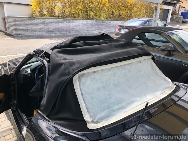 Gestern war ich bei Heinz und wir haben trotz des verschneiten Aprilwetters das neue Verdeck aufgezogen.