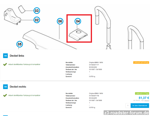 Der Z3 wurde in einem einheitlichen Prozess gefertigt, an einem Fließband. Eine Fragestellung die bei einem Auto auftaucht wird bei 297.088 gebauten Einheiten wohl kein Einzelfall bleiben und eines Tages einen anderen Zettisti plagen. Deshalb ist die Wiederauffindbarkeit "das A und O".