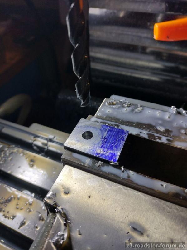 M8 Verbindungssschraube, wie beim Edelstahlband halten wir bei. Fertig gebohrt, damit der Fräser später weniger Arbeit hat.