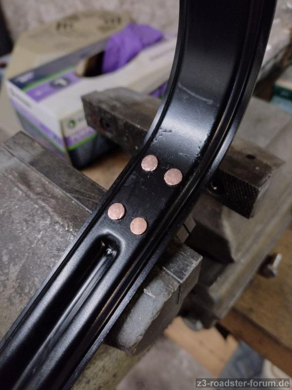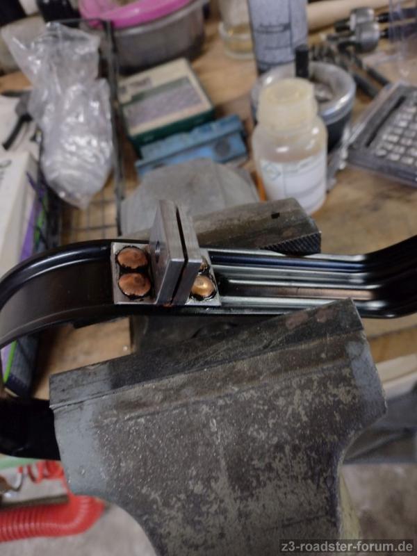 Dann etwas Hammerite als Korrosionssschutz auf die Auflagefläche. Anschliessend verklebe ich das T mit Karosseriekleber auf dem neuen Spannband. Nach abtrocknen des Klebers bohre ich die Löcher für die Vernietung durch das Band, und verniete alles.