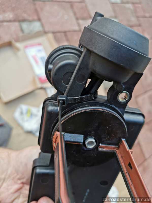 Und noch ein Tipp zur Vereinfachung: Der Betätigungshebel ist immer etwas im Weg, wenn man die neue Achse/Exzenter einsetzen will. Da man dabei auch noch die Klappe halten muss, braucht man dafür schon beide Hände. Deswegen habe ich den Betätigungshebel mit einem Kabelbinder nach unten fixiert (Bild 2 und 3). Jetzt kann man besser arbeiten.