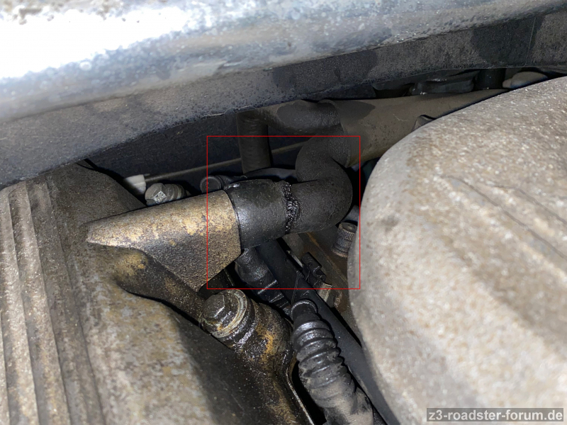 Deren gibt es wie im 2. Bild zu sehen drei Stück, wobei der vordere das Thermostat enthält und leicht gewechselt ist, der untere unter der Ansaugbrücke verborgen liegt und daher so ohne weiteres nicht zugänglich ist (aber auch nicht so empfindlich), und der hintere an der Stirnwandseite. Der bricht sehr gern als erstes.