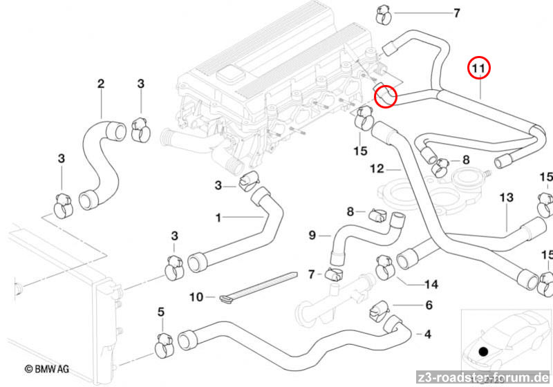 Da es aber vor allem in dem Bereich nass/schmierig war und nach unten getropft hat, habe ich jetzt den von Steffen beschriebenen hinteren Kunststoff-Flansch an der Stirnwandseite samt Schlauch unter Verdacht. Ist es richtig, dass der in dem Screenshot bei der Nr.15/12 zu finden ist? Sollte der einigermaßen zugänglich sein, dann werde ich mir das noch mal genauer anschauen. Leider ist die Nr.12 im Leebmann24 Shop das einzige Bauteil ohne weitere Beschreibung/Bestellmöglichkeit. (https://www.leebmann24.de/bmw-ersatztei ... bt=11_1567)