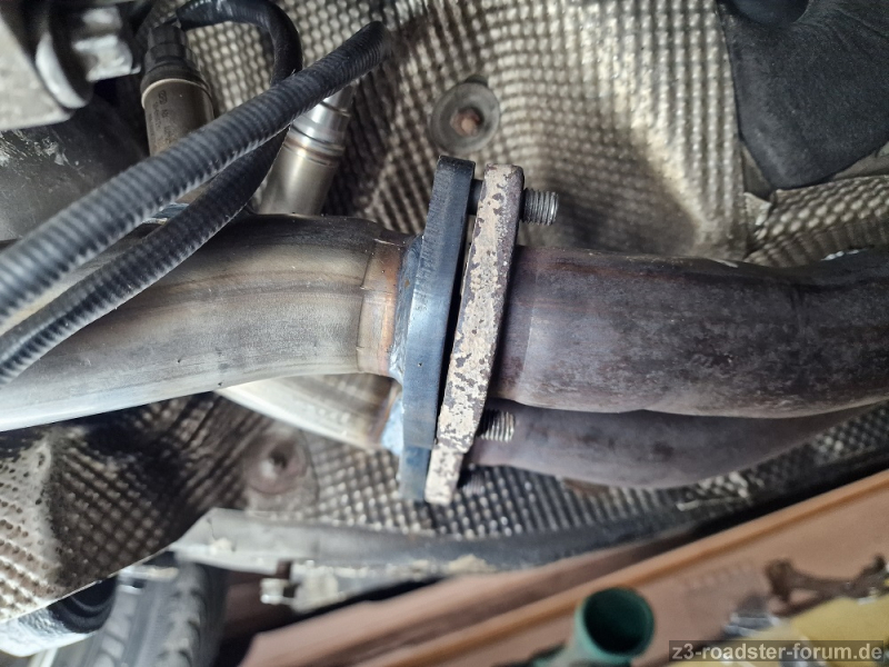 Fazit: Die Flansche sind jetzt quasi parallel. Aber der Winkel zur Abgasanlage stimmt trotzdem nicht, die Flansche müssten steiler stehen, so zieht es den MSD total ins Hitzeschutzblech rein. Ein riesen Kack...