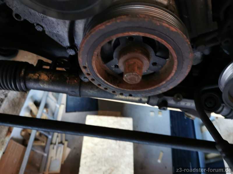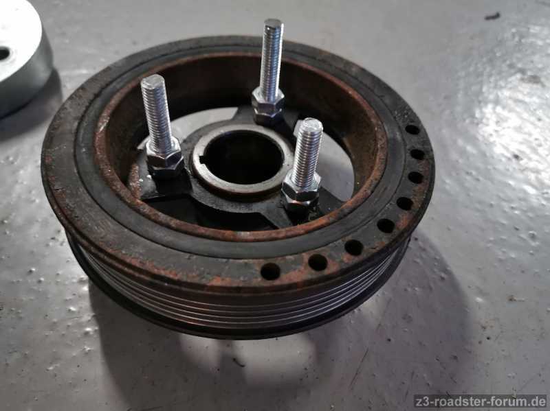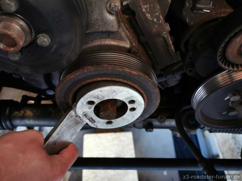 Nun häng ich bei der Riemenscheibe. Mein "Spezialwerkzeug" hats nicht überlebt... Wie ich befürchtet habe wird das ein größeres Problem. Über meinen Akku-Schlagschrauber lacht die bloß. Und das obwohl die ja vor 4 Jahren schonmal auf war. Also nichts mit 19 Jahre festgegammelt oder so...