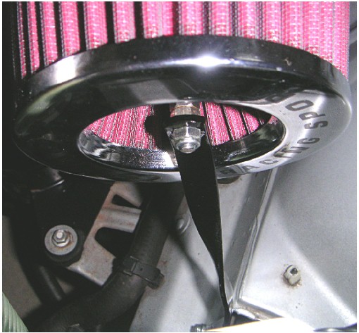 Heute bei angenehmer Temperatur habe ich endlich einen Halter an den Twin Sportluftfilter angebracht. Der Halter besteht aus einem 240 mm lagen und ca 13 mm breiten Flacheisen das wie im Bild zu sehen im Schraubstock gedreht wurde. An beiden Enden ist ein 6,5 mm große Bohrung angebracht. An der unteren Blechkante war schon eine Bohrung für den Halter vorhanden die als Haltepunkt benutzt wurde. Eine 15 mm lange VA Schraube mit zwei U-Scheiben und einer selbstsichernder Mutter fixieren den Halter an der unteren Blechkante. Oben am Lufi ist auch eine selbstsichernde Mutter zu sehen.