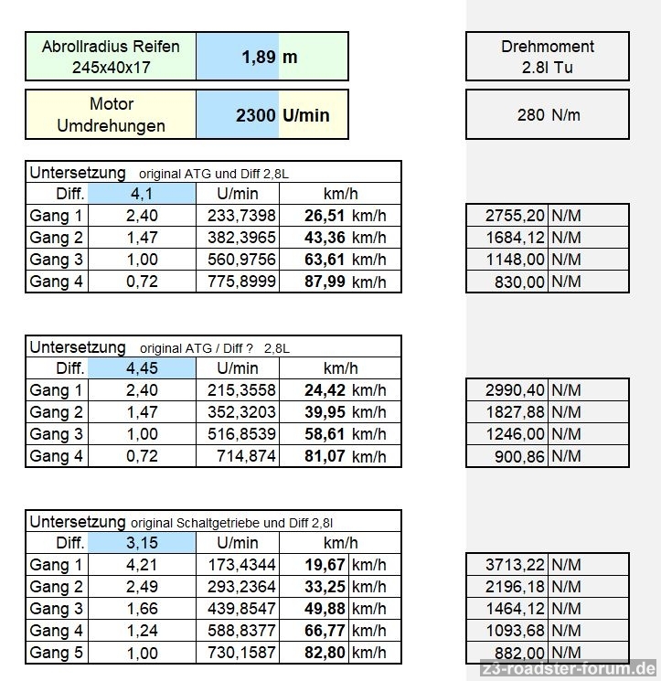 Erste Tabelle Diff-Untersetzung original: ( Automatiggetriebe beim M52B28Tu Zetti = 1:4,10)(beim Motor hatte sich auch ein Fehler eingeschlichen)