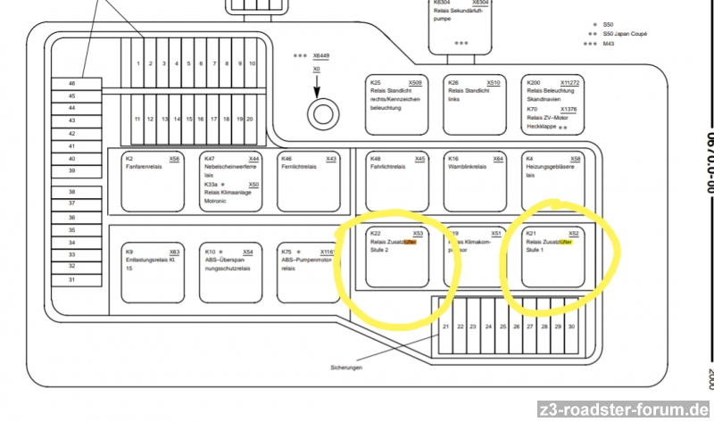 Als nächstes hier im Forum die Schaltpläne geprüft und für mein Auto 1.9i von 2001 sollte diese eigentlich auch über die Sicherungen 13, 16 und 48 abgesichert sein. Passt auch perfekt mit diesem Thread hier zusammen: https://www.z3-roadster-forum.de/forum/viewtopic.php?f=18&t=21845&p=185388&hilit=temperaturschalter#p185388