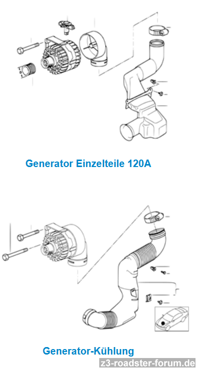Danach habe ich gleich mal im Motorraum (2.8 VFL) nachgeschaut, konnte aber diesen Schlauch nicht finden. Die "Endkappe" an der Lichtmaschine, an die der Schlauch angeschlossen wird, war auch schon halb zerbrochen. Eine gute, gebrauchte Endkappe konnte ich bereits auftreiben, aber beim Schlauch bin ich noch etwas ratlos, da es hier scheinbar zwei Versionen gibt.