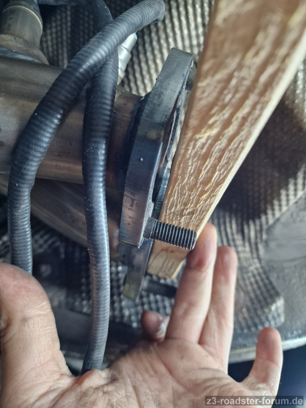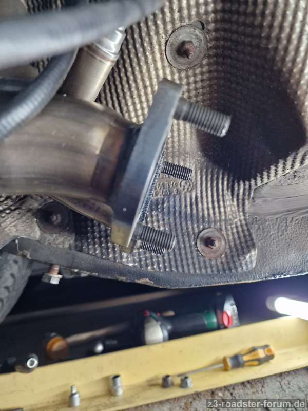 Fazit: Die Flansche sind jetzt quasi parallel. Aber der Winkel zur Abgasanlage stimmt trotzdem nicht, die Flansche müssten steiler stehen, so zieht es den MSD total ins Hitzeschutzblech rein. Ein riesen Kack...