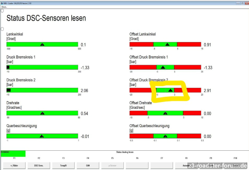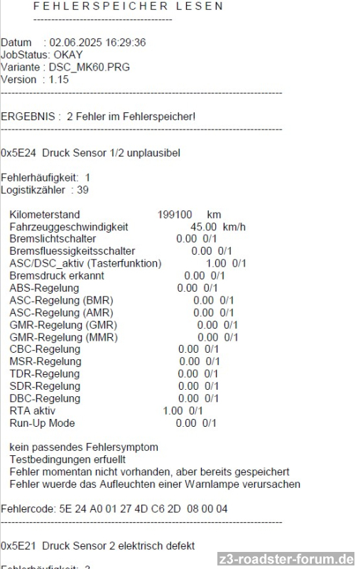 -Direkt nach dem Austausch leuchteten die beiden gelben Kontrollampen wieder im Kombiinstrument auf, allerdings ergab die Fehlerspeicherauslese keinen Fehler des Drehratensensors, sondern "ABS Drucksensor 2". Letzteres wurde zuvor nicht als Fehler ausgegeben.