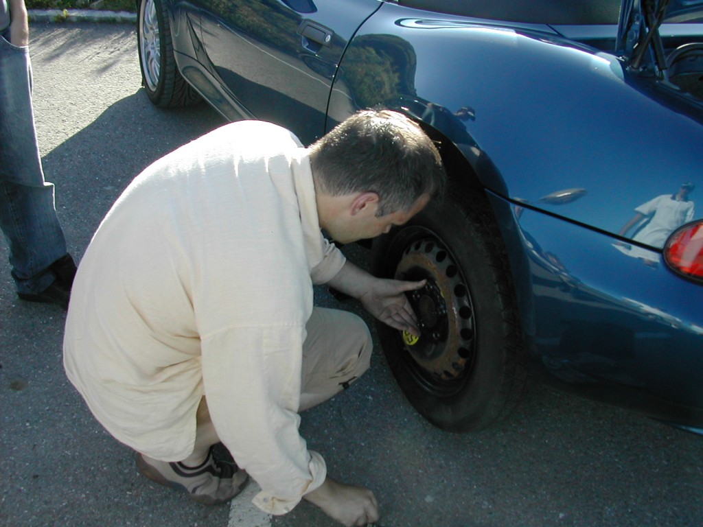 Einer kann schon mal das alte Rad abmontieren, während Nr. 2 mit viel Mühe und Geschick irgendwie das Notrad unterm Auto drunter wegzaubert. Anschließend kann Nr.2 das Notrad an Nr. 3 übergeben, welcher das Notrad wenigstens notdürftig mit Luft aus dem Kompressor befüllt. Während Nr.1 nun noch immer mit dem Abmontieren beschäftigt ist, kann Nr. 2 noch gerade ein paar gute Ratschläge geben und die verzweifelte Fahrerin aufmuntern. :lol: