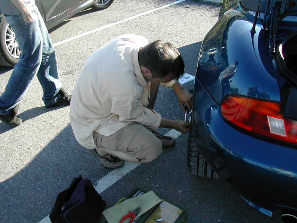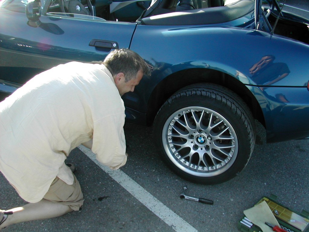 Nach Demontage des defekten Rads, kann Nr. 3 den Kompressor wieder zusammenpacken und im geräumigen Z-Kofferaum verstauen.