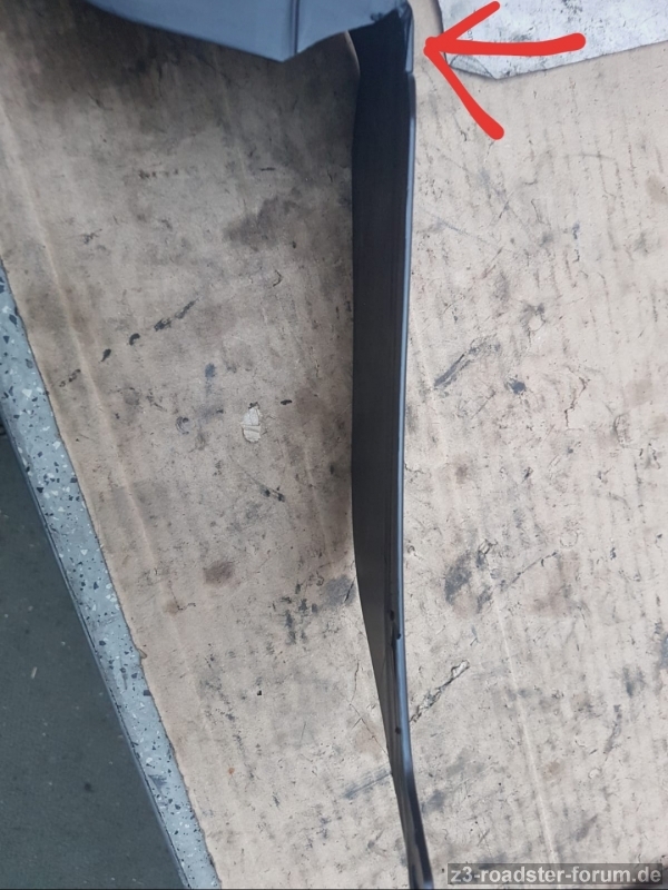Den nach oben gebogenen Anteil (mit dem Befestigungsloch) der harten Kunststoffleiste so entfernen, dass die Konturen des Verlaufs der Gummierung und des Kunststoffes sich kreuzen und harmonisch eine saubere Ecke ergeben.