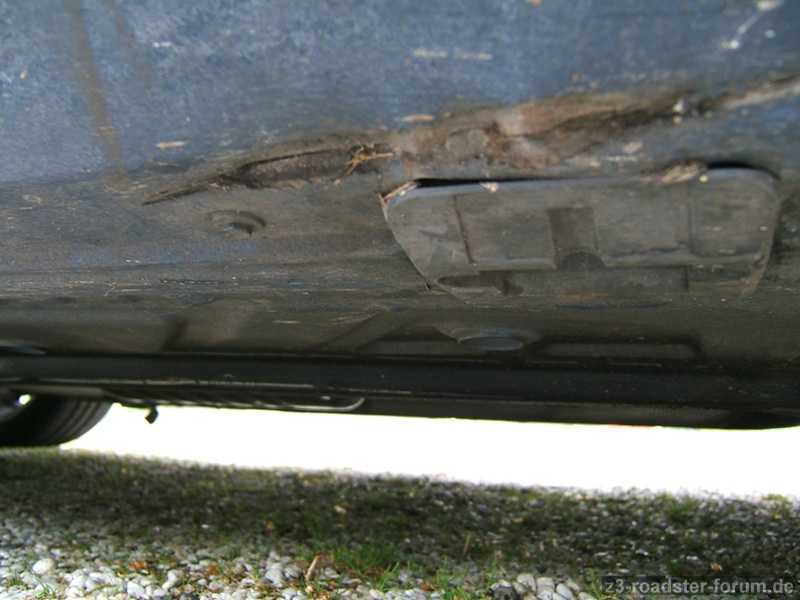 Vor 2 Tagen gehe ich bei hellem Sonnenlicht von der Seite auf mein Auto zu und sehen einen deutlichen Knick im rechten Seitenschweller – vorne bei der Aufnahme für die Hebebühne.