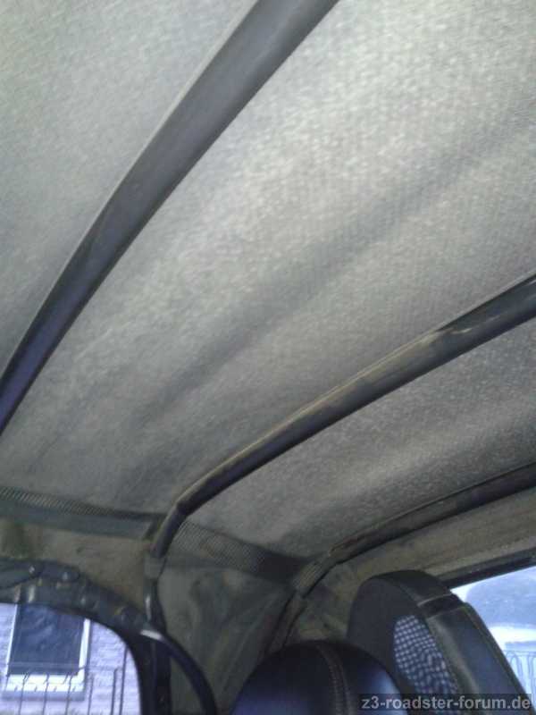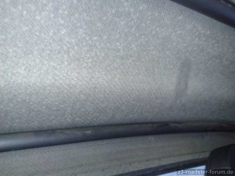 wie der Titel schon sagt, habe ich ein riesen Problem mit meinem Z3. Über die gesamte Innenfläche des Verdecks zieht sich eine dünne und auf den ersten Blick kaum sichtbare "Schimmelschicht". Und genau da liegt das Problem: In der momentanen, dunklen Jahreszeit sitze ich fast ausschließlich im Dunkeln im Z3 und da ist mir das nicht aufgefallen. Heute saß ich das erste mal seit längerem tagsüber im Auto und musste ein paar Minuten auf einen Freund warten. Beim gelangweilten durch die Gegen gucken ist mir das Problem dann aufgefallen. Ohne direkte Lichteinwirkung unterscheidet sich der Belag farblich kaum vom dunklen Verdeckstoff. Auf den Fotos sieht das ganze daher z. B. wesentlich extremer aus, als es real der Fall ist. Mich wundert auch, dass der Belag so auch auf den Alustangen des Verdecks sichtbar ist. Hier dürfte sich Schimmel doch eigentlich nicht wohl fühlen, oder???