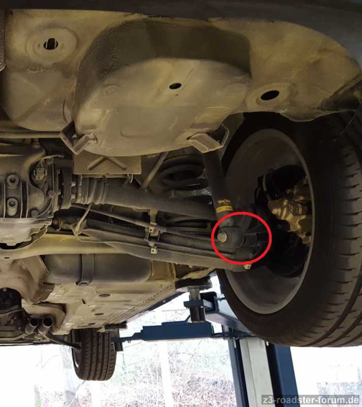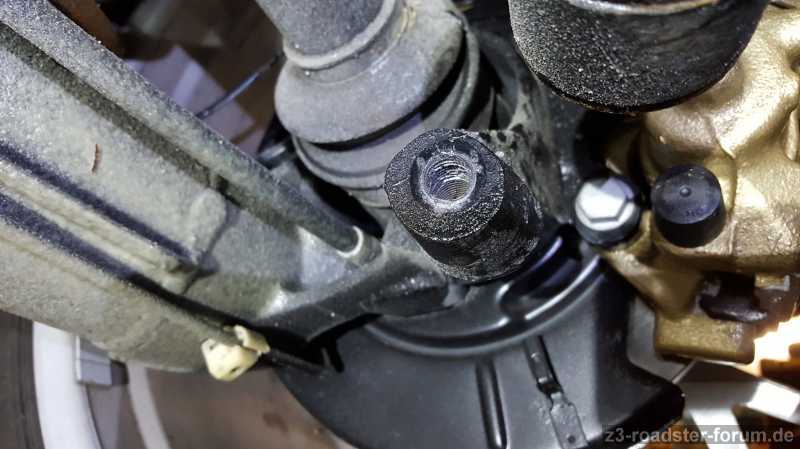 Das Fahrzeug war dazu soweit angehoben, dass die Räder noch den Boden berührt haben, die Stoßdämpfer und Federn aber weitestgehend entlastet waren. Das Foto oben stammt nicht von gestern, es dient nur als Prinzipbild, welche Scheibe und Verschraubung gemeint ist.