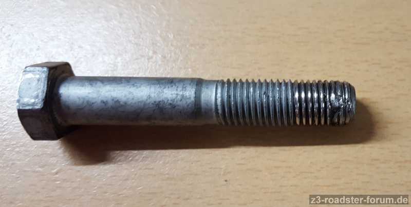 Beim Herausschrauben der Schraube merkte ich einen starken Widerstand, die herausgeschraubte Schraube und das Innengewinde im hinteren Längslenker weisen starke Schäden auf.