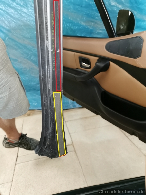 Im rot markierten Bereich habe ich daher noch separat ein spezielles Tesa-Klebeband angebracht, welches auch auf EPDM (= Dichtungsmaterial) hält. Lasst euch vom ersten Eindruck nicht täuschen, das Klebeband hält wirklich, wenn die Dichtung erst einmal an die Karosserie angedrückt wurde.
