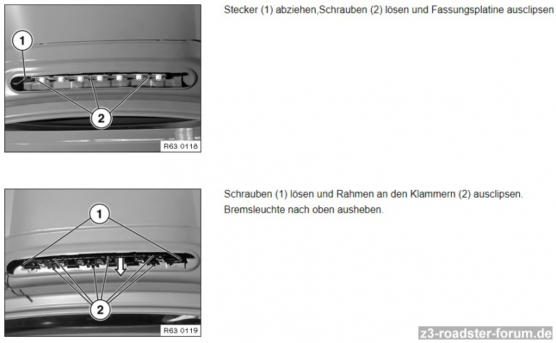Beim Facelift löst du von innen 3 Muttern, stöpselst das Kabel ab und nimmst die ganze Bremsleuchte mit dem lackierten (oder verchromten) Metallteil/-Deckel ab. Dann ist die eigentliche Bremsleuchte mit 3 Torxschrauben an dem Metallteil befestigt. Die Dichtungsscheiben sind aber auf den Bolzen die per Mutter am Kofferraumdeckel befestigt sind.