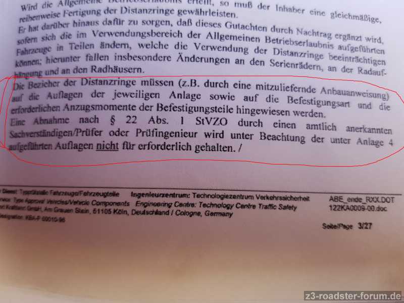 zumie hat geschrieben:Ich habe noch nie Probleme mit Distanzringen,die eine ABE haben,gehabt,Auch vor kurzem nicht,bei meinem blauen,der Prüfer hat such nur die ABE der Ringe angesehen.Ich habe H&R Ringe.Gefunden in der ABE habe ich das.und nun?Es wäre ja auch widersinnig,wozu eine ABE,wenn dann ein Teilegutachten reicht,mit dem man zum TÜV fahren muß,und zum Eintragen.
