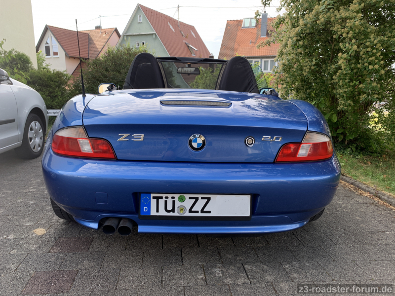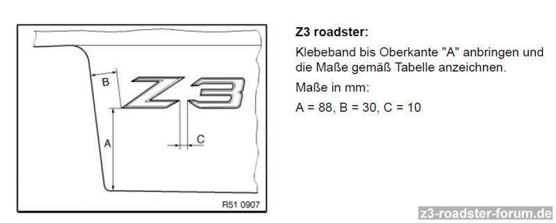 Gemäss Montageanleitung von BMW. Z3 = 88mm ab Unterkante der Heckklappe und 30mm ab linker Gerade der Klappe. Kleinster Abstand zwischen Z und 3 = 10mm. Motorisierung rechts ebenfalls 88mm ab Unterkante. Seitliche Position habe ich nach Augenmass gemittelt.