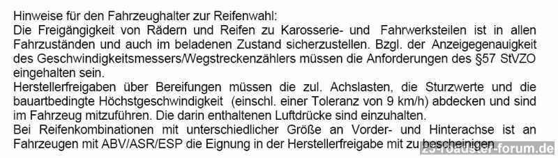 Robi1987 hat geschrieben: Toll ey, ich raste aus. In dem H&r Gutachten steht als Hinweis für den Fahrzeughalter, dass die Reifen die passende Achsenlast, Sturzwerte und so haben muss....Wo krieg ich jetzt ein Reifengutachten von der Marke Champiro her (245/40 17Zoll)?