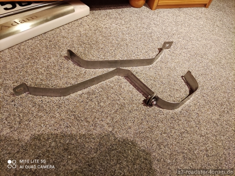 Es geht voran,die ersten Sätze sind fertig.Ich habe auch das geteilte Band probeweise eingesetzt,dazu muß das Hitzeschutzblech gelöst werden,und das Handbremseil aus der Halteung gelöst werden,alles nicht schlimm,Dann das längere Teil,über den Achsträger schieben,und das Teil mit dem Langloch in die richtige Position drücken.Ich habe es mit dem Wagenheber gemacht,schöner wäre eine Grube oder Hebebühne.Für die Montage ist alles dabei,Schrauben und Unterlegscheiben.Was ihr euch besorgen müßt,falls nötig,der Schaumstoffstreifen zwischen Spannband und Tank.