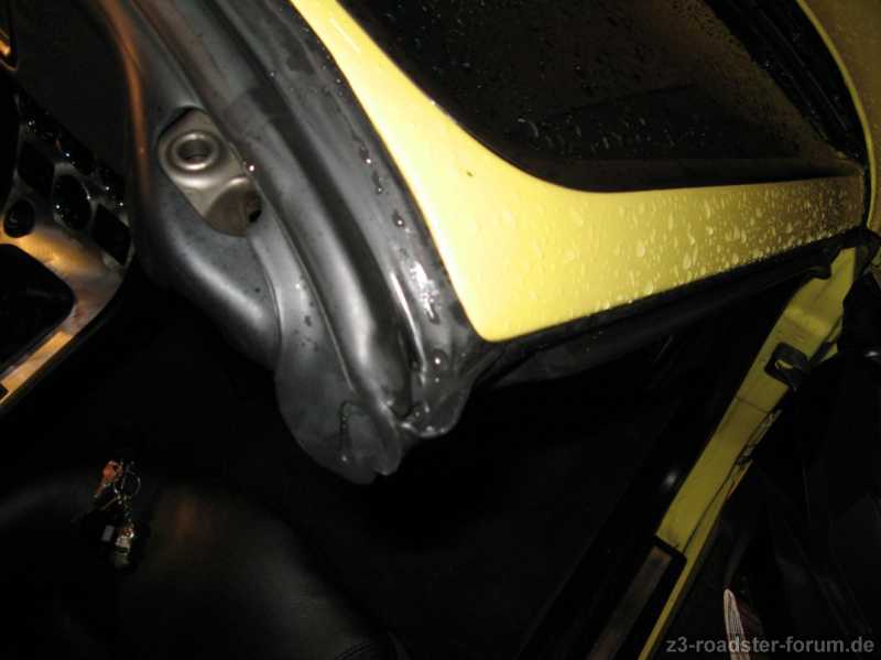 Ist dieses Löchlein verstopft, findet das Wasser leicht seinen uns allen bekannten Weg über die Spitze des Dreieckfensters und die seitlichen Gummidichtungen des Verdecks bis zur Fenstermitte und dann auf den Sitz.