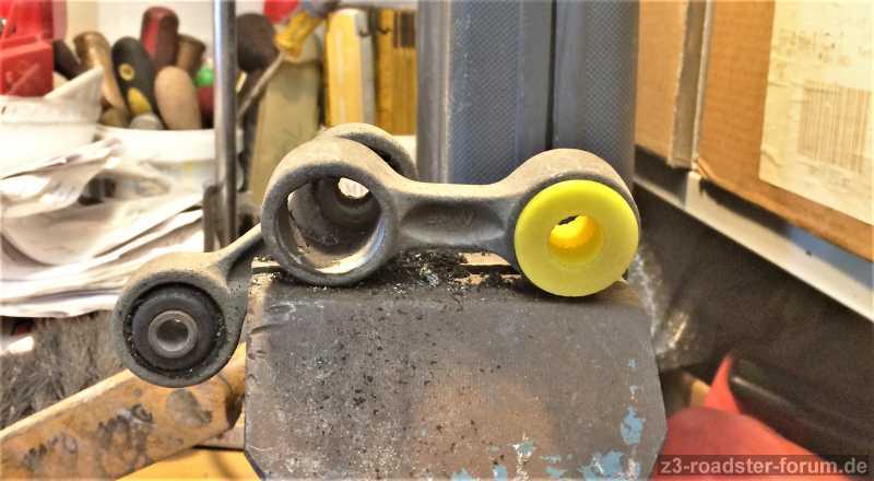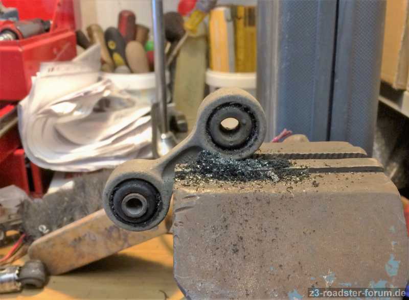 hat jemand eine geunaue Anleitung wie ich den Stabi hinten (Z3 Roadster 4/99) ausbeuen kann um die Linke Koppelstange zu wechseln? (Oder kann man eine neue Koppelstange mit Reifenmontagemittel im Gummiauge und Stabizapfen auch im eingauten Zuistand von Hand aufschieben/drehen? (Der Feundliche sagt, Koppelstange in Schraubstock spannen und Stabi drehen und schieben. Braucht man soviel Kraft?) Muss der Auspuff runter? Koppelstange (alt) wurde wieder komplett mit dem Gummiauge auf Stabi geschoben, nach einer Fahrt nur noch 50% des Stabi im Gummiauge, wie vorher, springt wahrscheinlich wieder heraus (10 Jahre alt) und neu Stange muss rein.