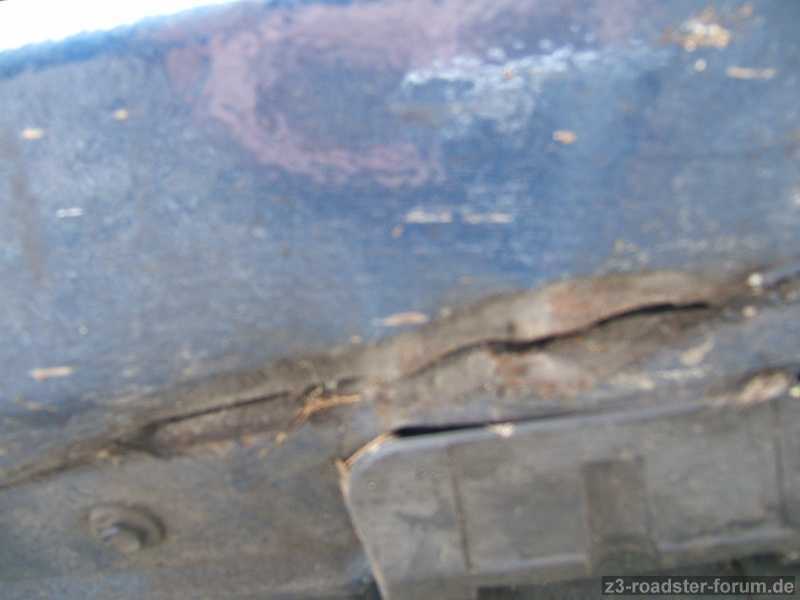 Beim näheren Betrachten trifft mich der Schlag. Ein fetter Riss im Blech des Seitenschwellers.