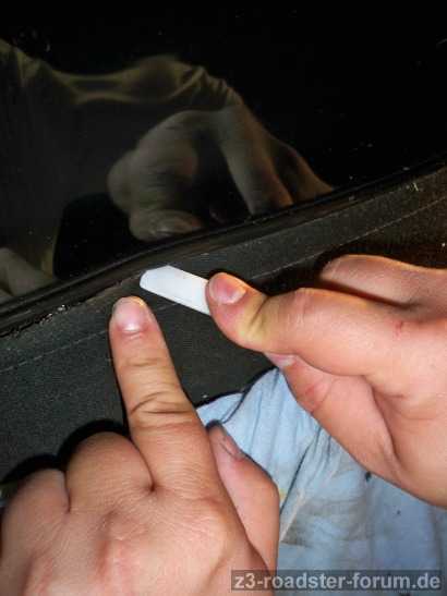 4. Stück für Stück den Kleber aufgebracht und mit einem Kunststoffkeil unter den Keder geschoben.