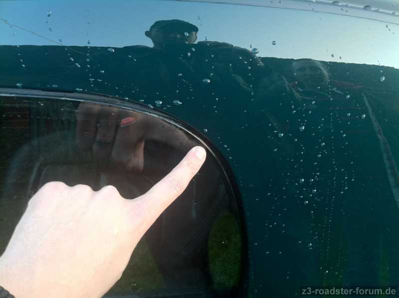 Aber auf der Fahrerseite läuft das Wasser oben "rein" - Wie auch auf der Beifahrerseite (Bild 1). ABER: In der Säule ist beim Übergang von Hardtop (bzw. Softop) eine Art "Führung" für das Wasser (Bild 2). Auf der Beifahrerseite wird das Wasser damit auch aus dem Fahrzeuginneren geführt - Bei der Fahrerseite allerdings nicht