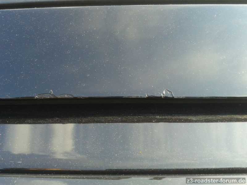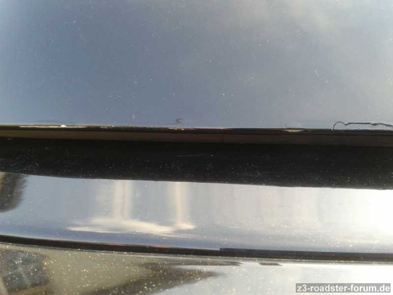 Ok, nichts Tragisches, aber an der hinteren Kante (unter der Scheibe) ist das Hardtop scheinbar mal etwas unanft abgesetzt worden oder Ähnliches, da über die komplette Breite mehrere kleine bis mittlere Katschen vorhanden sind. Die Fotos sind aus unmittelbarer Nähe aufgenommen, um die Schäden im Detail zu zeigen, daher wirkt das ganze auf den Fotos dramatischer, als es in Wirklichkeit ist. Steht man 2 Meter vom Auto entfernt, sieht man das ganze schon gar nicht mehr. Trotzdem bin ich bei sowas "pingelig" und ich würde es gerne entfernen. Zumal man auf dem zweiten Foto sieht, dass der Lack an einer Stelle wirklich abblättert und schon die Grundierung durchkommt, was mit der Zeit sicher nicht besser werden wird. Hier müsste also auf jeden Fall was gemacht werden.