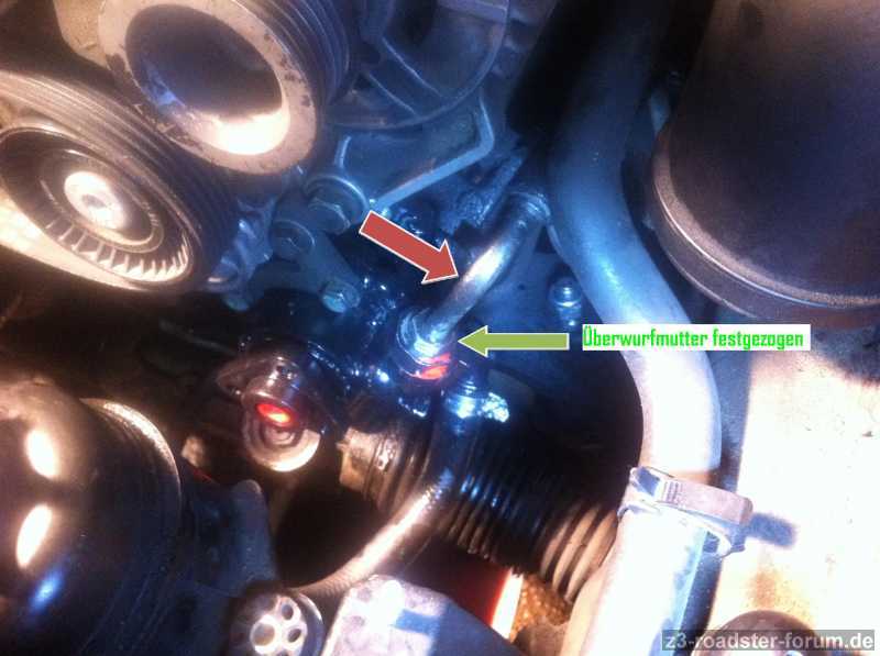 Leider bin ich jetzt kurz vor Ende der Arbeiten auf ein Problem gestoßen: der Hochdruckschlauch der von der Servopumpe zum Lenkgetriebe führt lässt sich nicht festmachen. Ich habe die Überwurfmutter (oder wie das Ding heißt