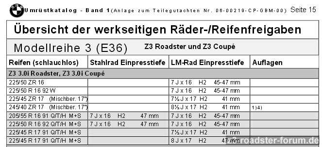 Hierbei fiel mir auf, dass ich als Sommerbereifung 7,5 x 17" mit 225er Bereifung für alle 4 Räder fahren darf. Alternativ auch 7,5 x 17" und 8,5 x 17" als Mischbereifung.