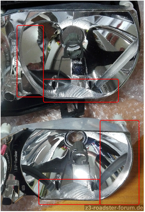 Die Bauart des Z3 Scheinwerfer nennt man Paraboloid-Scheinwerfer. Er besitzt zwei wichtige Bauteile die hier zur Identifizierung des Linkslenker (LHD) oder Rechtslenker (RHD) Scheinwerfers dienen.