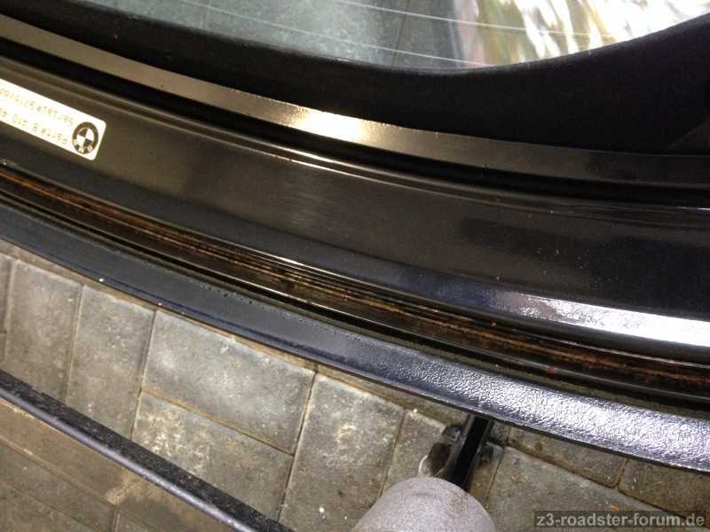 Leider habe ich bei der Reaktivierung und näheren Begutachtung samt Pflege der Dichtungen meines Hardtops festgestellt, dass dieses unterhalb und entlang der hinteren Dichtung (hin zum Kofferraum) leichten Rost angesetzt hat, siehe auch Fotos.