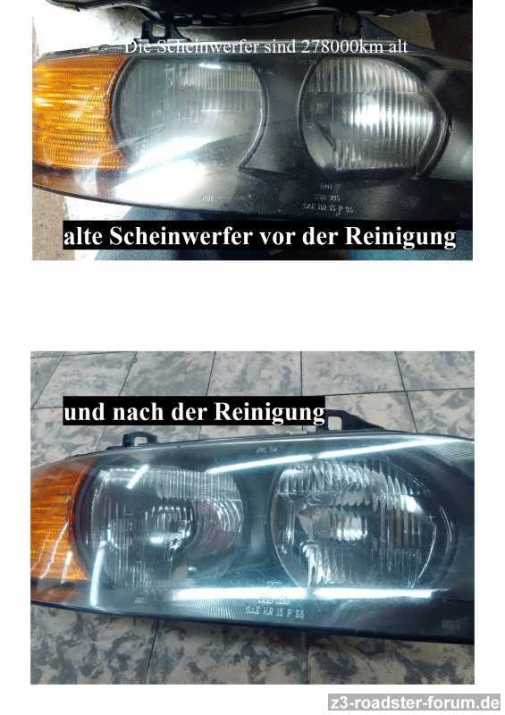 ...wie vor ein paar Tagen angekündigt https://www.z3-roadster-forum.de/forum/viewtopic.php?f=2&t=24161&start=2270 . Meine alten Scheinwerfer waren von innen trübe. Glas und Reflektor hatten einen Staub-Schleier. Trüb und das Licht auf der Strasse blieb zu wünschen übrig. Wer weiß was meine Vorgänger gemacht haben die in einen solchen Zustand zu versetzen. Habe jetzt die alten SW komplett unter Wasser mit Spülmittel getaucht, anschließend mit einem Schuß Fensterreiniger und Tropfen Klarspüler sozusagen von innen ausgewaschen. Mehrmals gut ausgespült und 24h auf der Heizung getrocknet. Ergebnis siehe Bild. Hätte ich jetzt keine neuen SW würde ich sie wieder einbauen. Da der Zustand vorher n.i.o. war, Haken gebrochen, Steinschlag etc. habe ich das Experiment gewagt. Jetzt glänzen sie wieder und es ist keine Ablagerung etc. zu sehen. Vielleicht ein Tipp der ein ähnliches Problem haben... Ohne Gewähr das es bei jeden so gut klappt. Wir haben hier sehr weiches Wasser, ohne Kalk... Mir war wichtig ohne mechanische Mittel und "aufbacken" die Reflektoren und das Innenglas sauber zu bekommen. Was meint ihr?